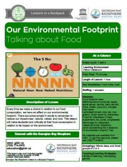 “Talking about Food” is one of a series of lessons that uses active learning to teach young children concepts associated with understanding their ecological footprint. Students explore their food choices in relationship to the 5 N’s (natural, near, now, naked, nutrition). As they critically examine how food consumption impacts the environment they are active participants in a hands-on learning process where they: