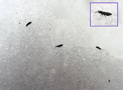 Regardez bien la neige à proximité du sol dégagé, et vous verrez peut-être ce qui, du premier coup d’œil, ressemble à de petits grains de poivre moulu. Si vous observez bien attentivement, vous en verrez peut-être qui se mettent à sauter et qui sembleront disparaître. On les appelle puces des neiges, mais il ne s’agit pas de véritables puces. Ce sont des collemboles des neiges, des membres d’un ancien ordre de minuscules insectes. Si vous les regardez attentivement à la loupe, vous verrez tout de suite pourquoi ils portent le nom de puce : ils sont munis d’une double épine dorsale à effet de ressort, repliée sous la queue qui, lorsqu’elle est relâchée, les projette à une distance allant jusqu’à 10 centimètres – pas mal pour un insecte qui mesure de 1 à 2 millimètres (imaginez un spécialiste du saut en longueur qui pourrait franchir 200 mètres – le record mondial est d’un peu moins de 9 mètres; pour le saut en longueur sans élan, une comparaison plus juste, le record est de moins de 3,5 mètres). La puce des neiges est active toute l’année et constitue peut-être l’ordre d’insectes le plus nombreux (on en trouve jusqu’à 25 millions par hectare!), mais comme elle est petite et mène une vie discrète dans le sol et les feuilles mortes, elle n’est visible qu’en cette période de l’année. Leur présence indique que le sol se porte bien.