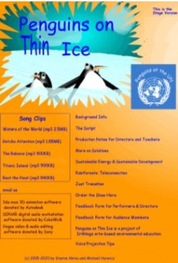 Penguins on Thin Ice is an eclectic web site put together by the non-profit organization, Irthlingz Arts Based Environmental Education and offers a musical review about climate change. This musical revue consists of a compilation of songs and scripts designed for student performances at grade 8-12 levels. Along with a complete script and mp3s files from the show, the site offers tips on staging and productions techniques. As well, downloadable feedback forms for both performers and audience members are provided. Other information on the site includes in-depth writings on sustainable energy and development, rainforests and other threatened habitats as well as "Just Transition", a labour practice that proposes "green" training for workers left unemployed after a shut down of unsustainable work. The site also includes a video performance of the musical by students of the High School for Environmental Studies in New York, for delegates to the UN Commission on Sustainable Development, May 4, 2007.