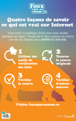 Cette ressource enseigne aux élèves comment évaluer de manière critique les informations qu’ils trouvent sur Internet en utilisant quatre étapes simples. Les élèves participeront à un atelier qui leur permettra d’apprendre une méthode en quatre étapes simples et rapides pour vérifier l’information en ligne. Après les avoir pratiqués, ils réaliseront un message d’intérêt public destiné à présenter une de ces étapes ainsi qu’à propager l’idée que chacun est responsable de vérifier l’information trouvée en ligne avant de la partager ou de s’en servir.